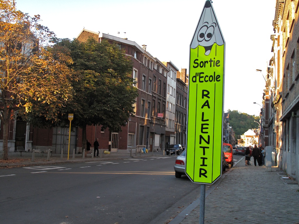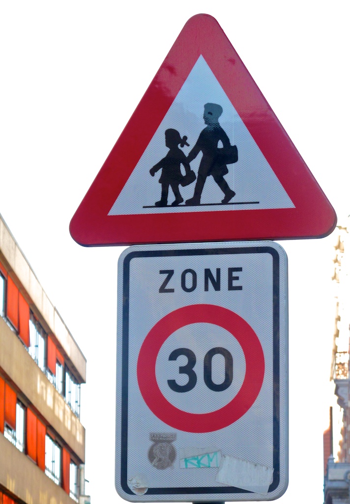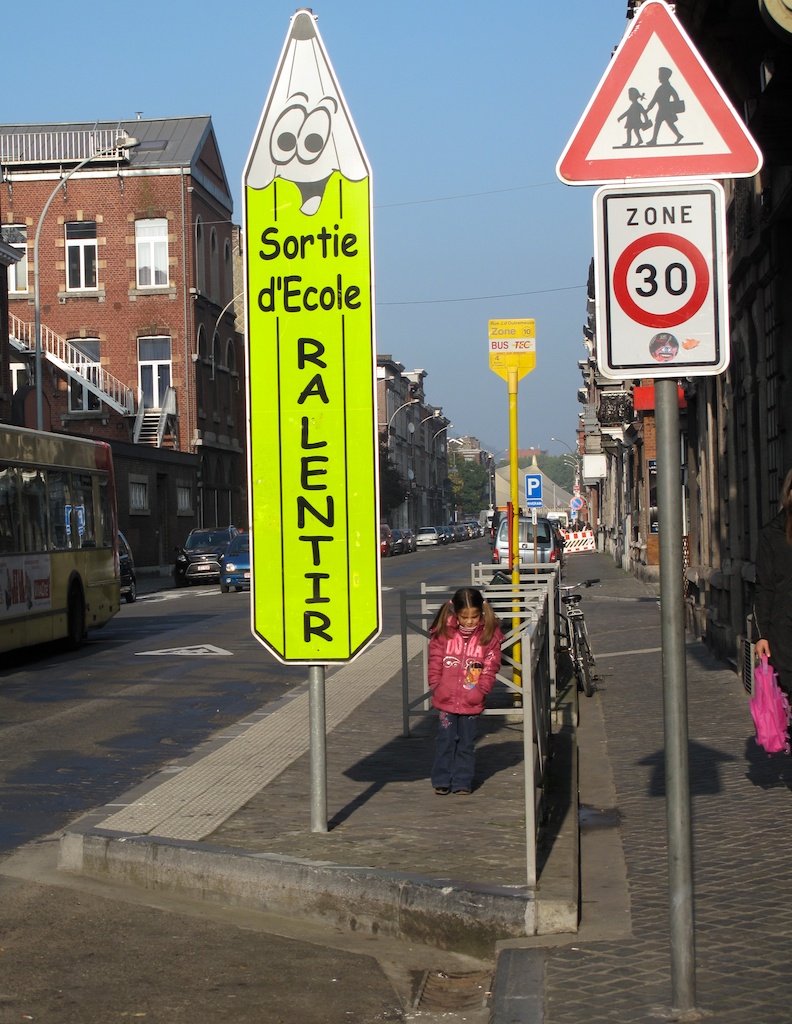 La « zone 30 scolaire » a été introduite en 2002 et généralisés en 2004 avec le « Code la Rue ». Toutes les écoles de Belgique ont donc leur zone 30, quelque que soit le type de route, elles ne sont pas toutes des réussites, voir l’exemple ci-contre sur un grand axe à Bruxelles. Voici quelques réalisations de zones 30 scolaires à Liège, principalement et à Bruxelles. Le signal « Zone 30 » est surmonté du panneau « attention enfants! » Voir photos ci-contre. Autres guides : Une zone de dépose-minute aux abords des écoles (IBSR 2012) Sécurité et visibilité des abords d’écoles (Région wallonne 2012) |