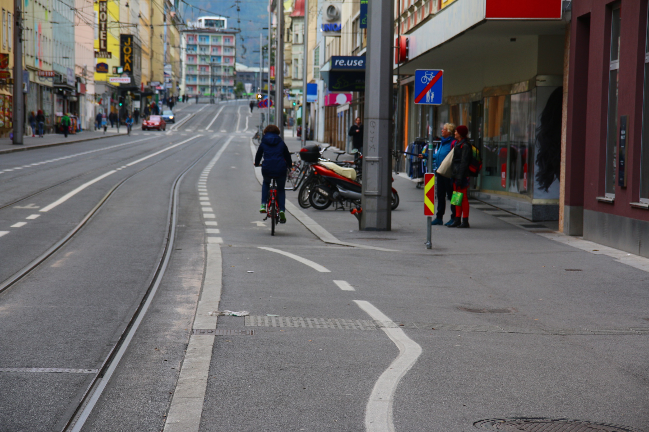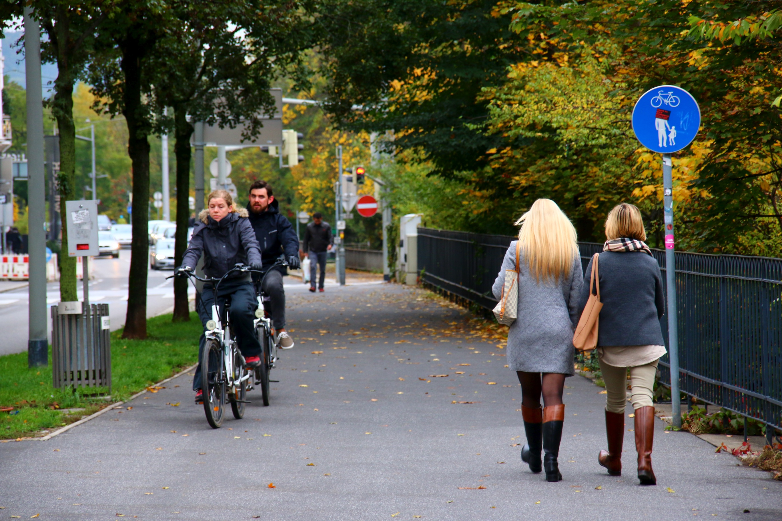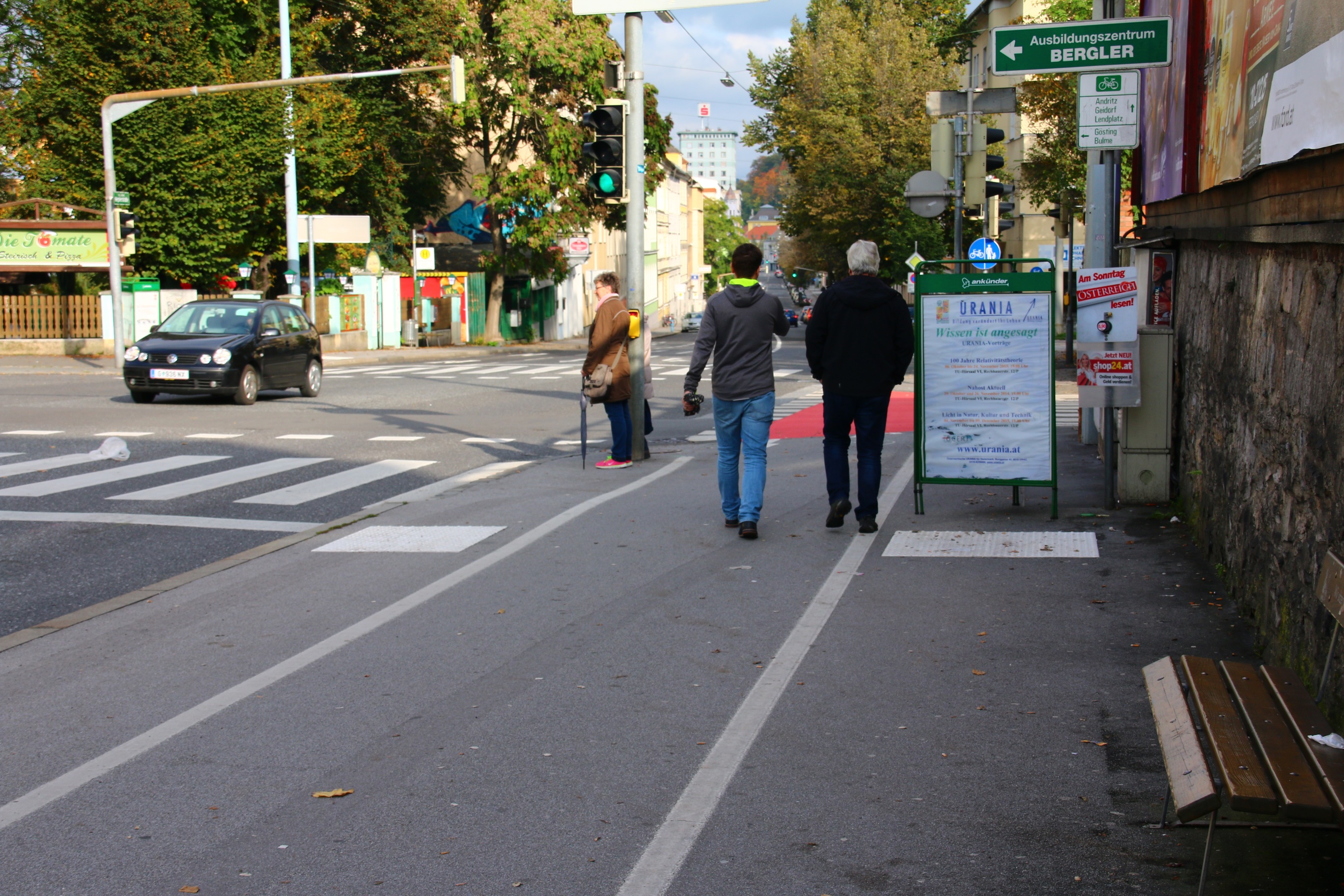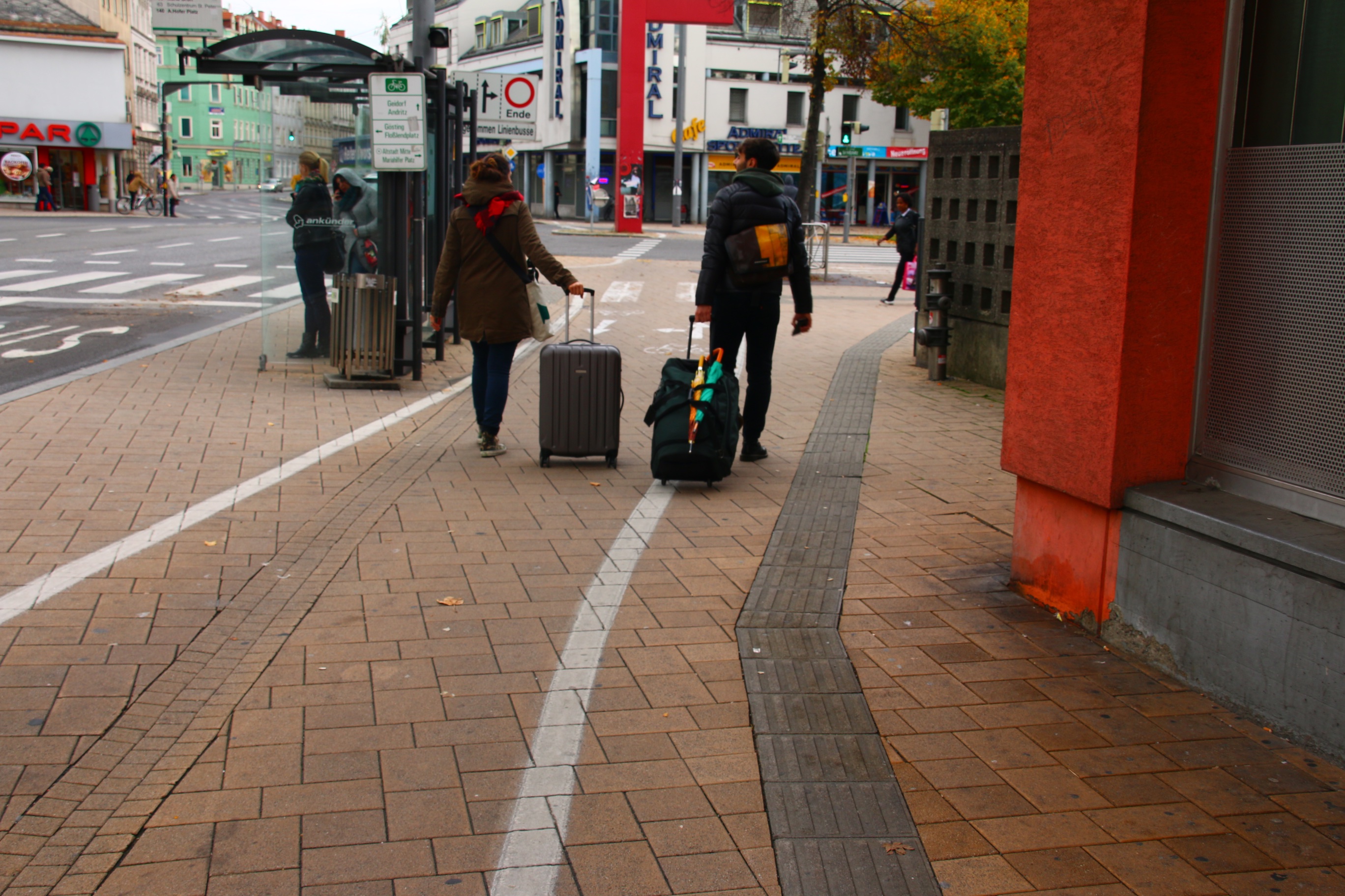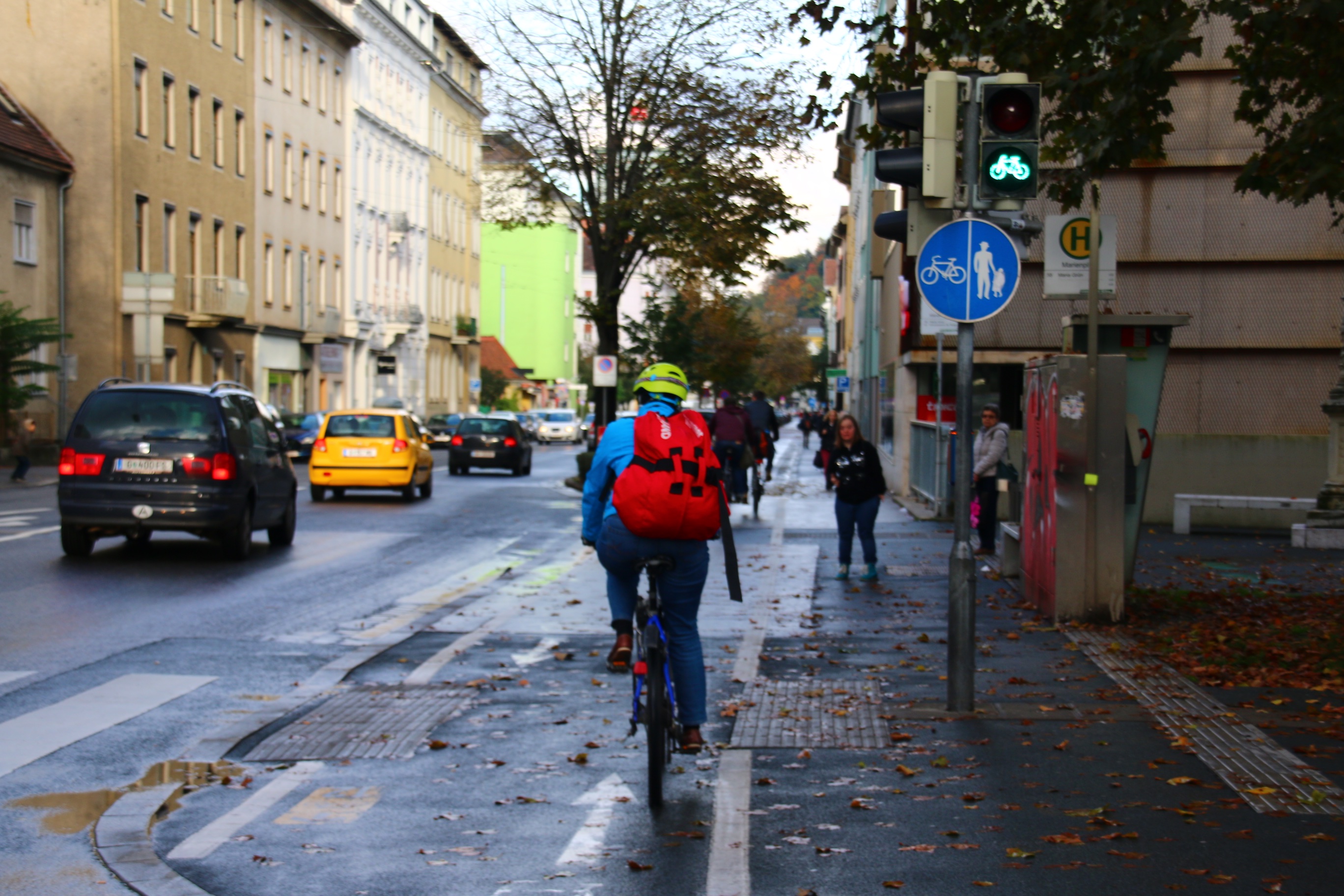 A Graz, la Ville a soigné cet aspect en essayant de sécuriser et de faciliter la mobilité douce sur ces axes. C’est particulièrement vrai pour les itinéraires cyclistes, généralement hors circulation (photos 6 et 9). C’est moins vrai pour les piétons qui doivent parfois partager leur espace avec les deux-roues légers. Dans certains cela crée des situations difficiles pour le piéton vulnérable – enfants, PMR ou personnes âgées en particulier (photo 10).