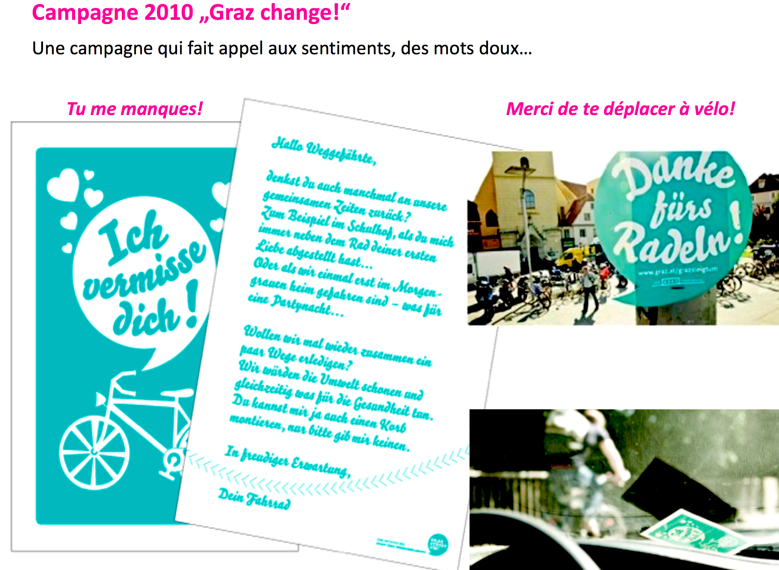 Voir de nombreux exemples dans la présentation – en français – que Gundrun Rönfeld, ville de Graz, a donné à Neuchâtel lors de la Journée Rue de l’Avenir 2013.