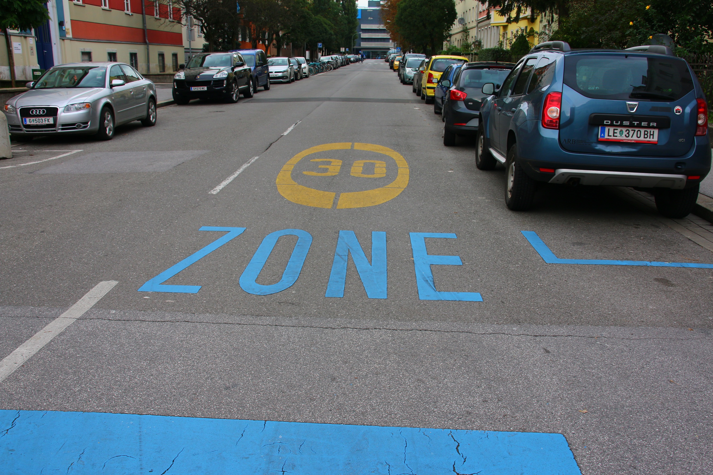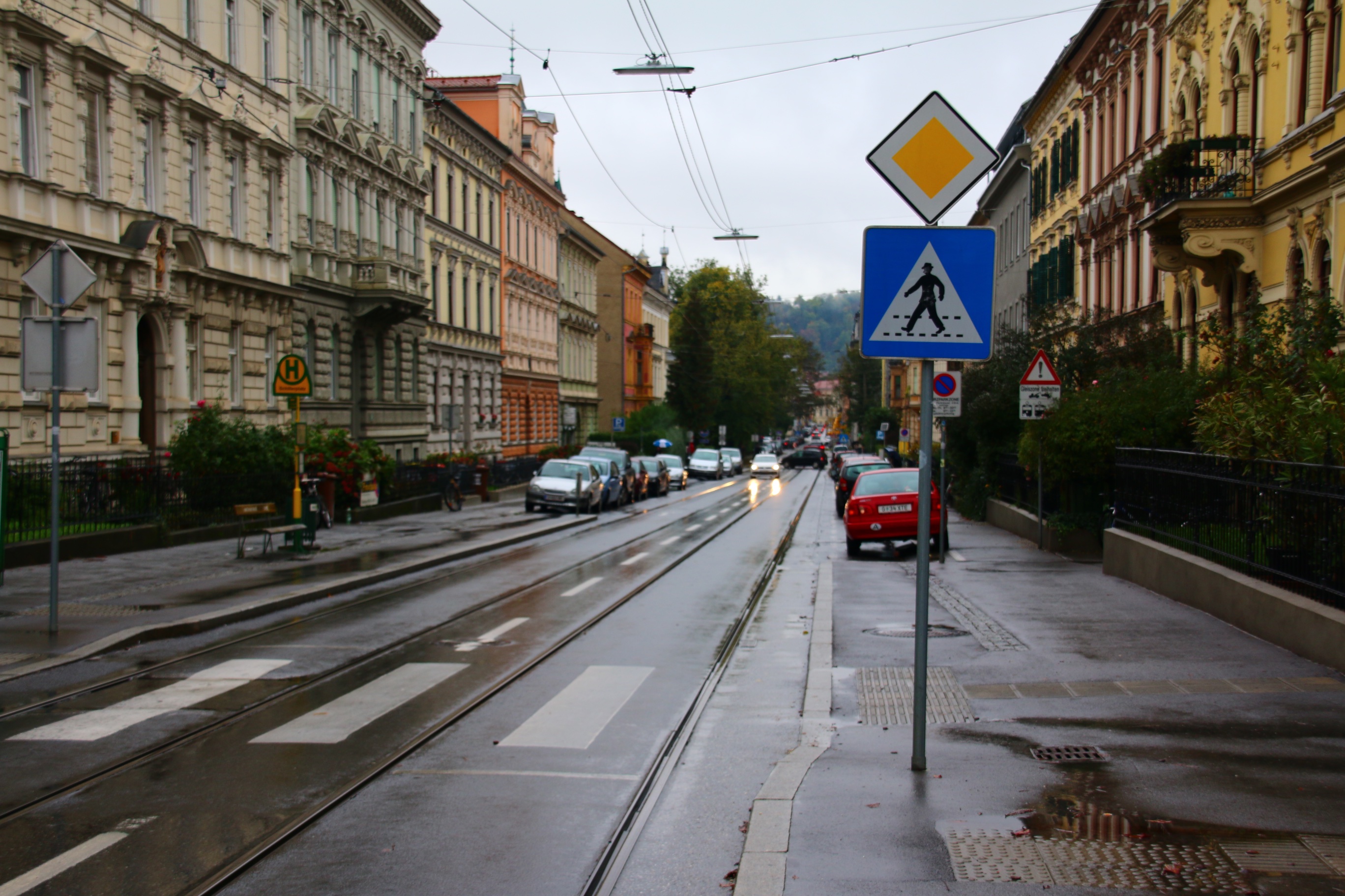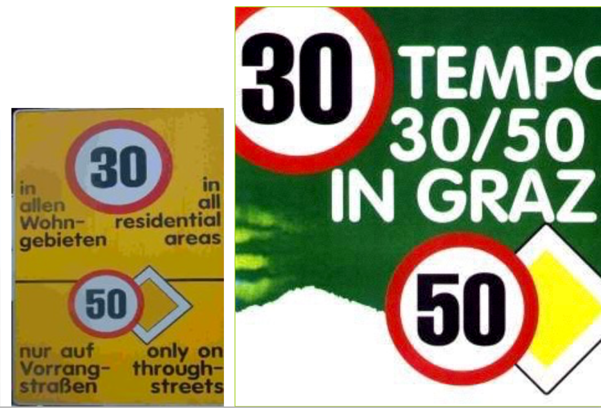 Graz, ville de 310 000 habitants (560 000 pour l’agglomération) est la première ville européenne à être passé au 30 km/h généralisé – il y a près de 25 ans – sauf exception pour les axes prioritaires, indiqués par un losange jaune habituel pour les rues / routes qui ont la priorité. Ces axes sont à 50 km/h sans que cela soit indiqué par la signalisation.