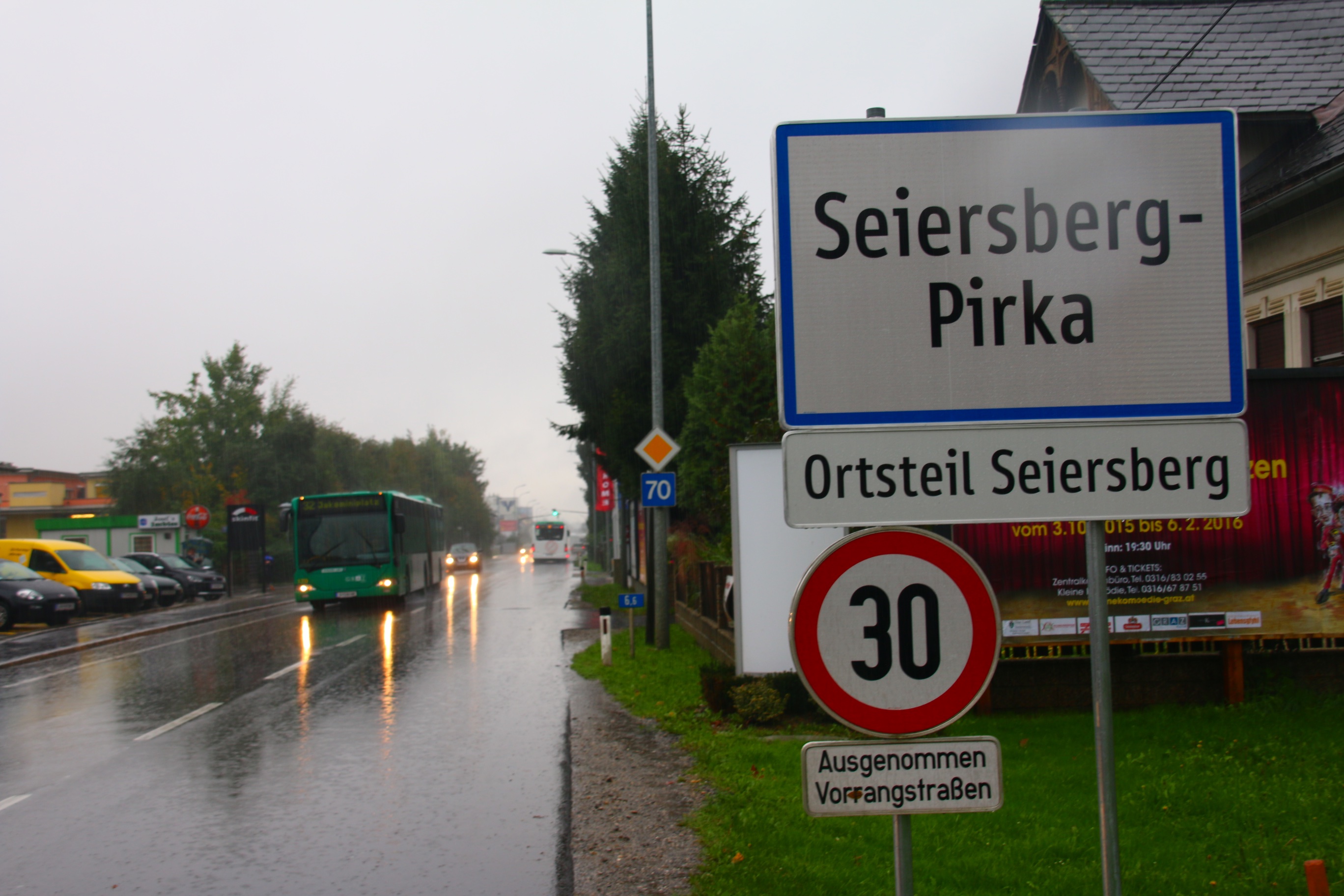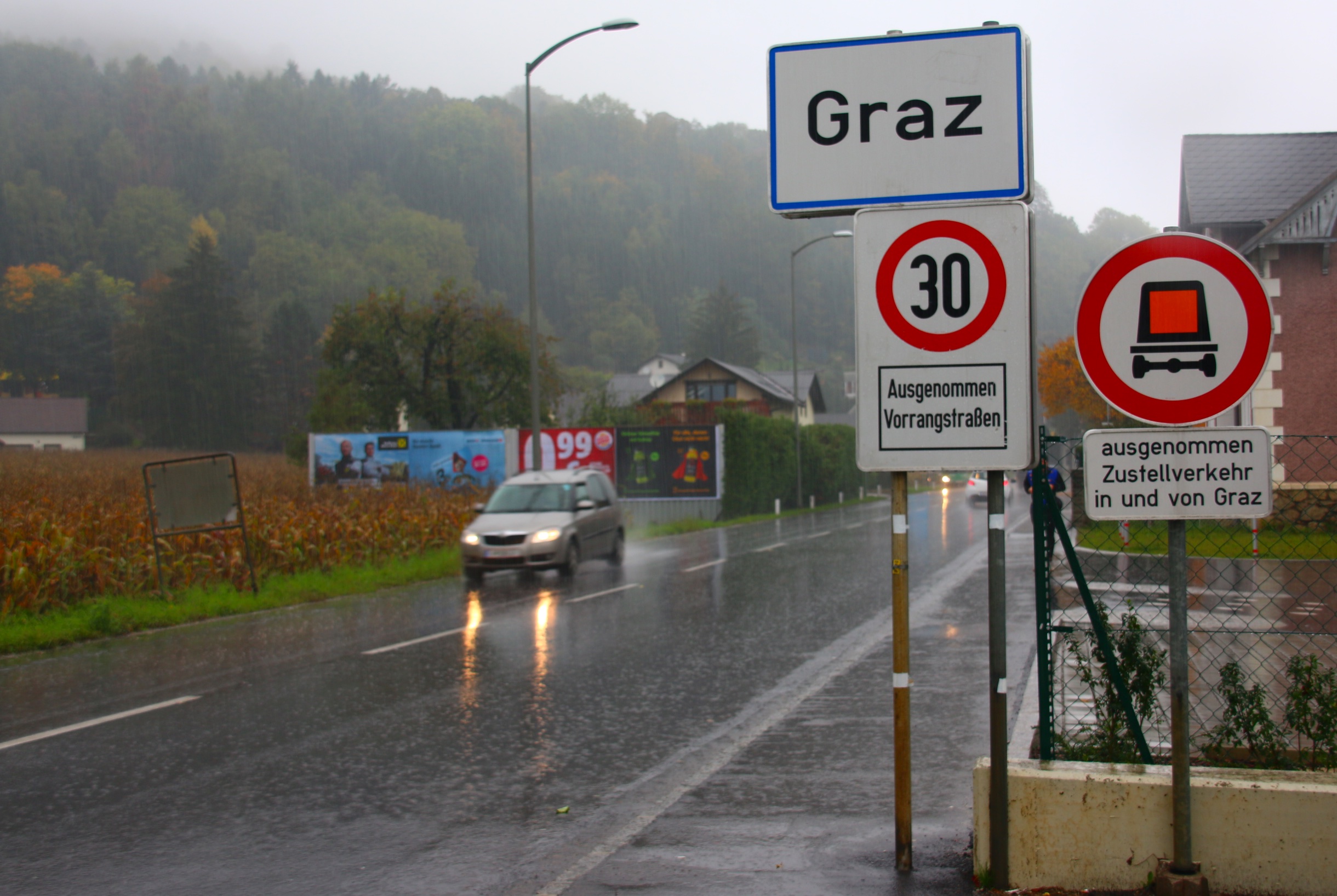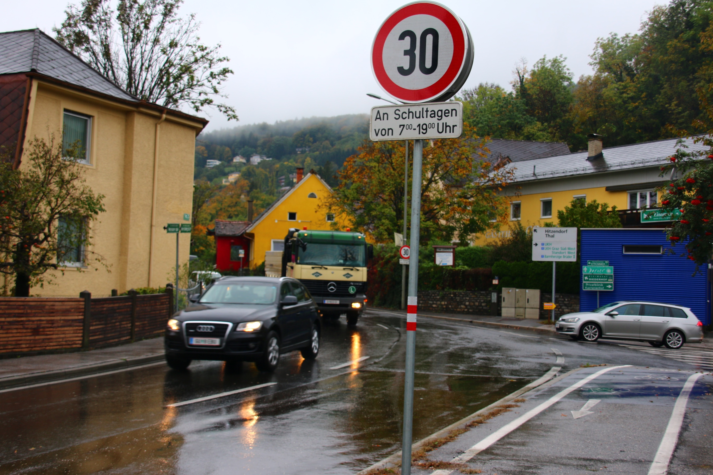 Graz, ville de 310 000 habitants (560 000 pour l’agglomération) est la première ville européenne à être passé au 30 km/h généralisé – il y a près de 25 ans – sauf exception pour les axes prioritaires, indiqués par un losange jaune habituel pour les rues / routes qui ont la priorité. Ces axes sont à 50 km/h sans que cela soit indiqué par la signalisation.